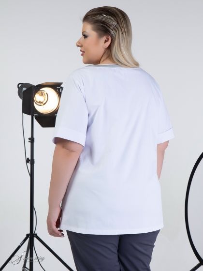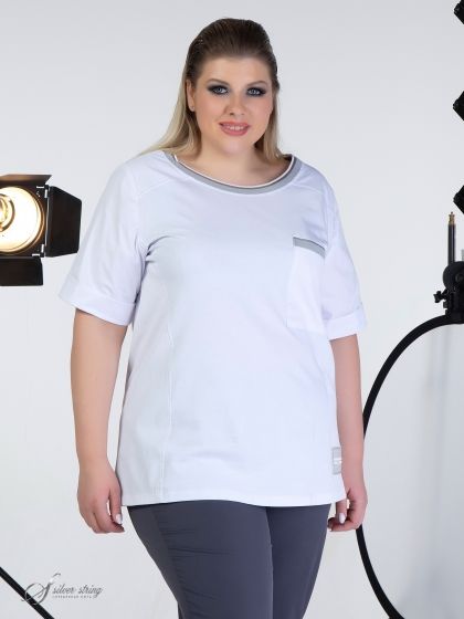 Летняя блуза прямого силуэта выполнена из однотонных материалов - компаньонов: высококачественное трикотажное полотно сочетается с тканью из натурального волокна. Рукав втачной, длиной до локтя, понизу оформлен отворотом. На полочке расположены подрезные кокетки. Линия горловины округлой формы, слегка расширена к плечам. Боковые швы нарочито смещены на полочку. Линия горловины и верхний срез нагрудного кармана оформлены трикотажным подвязом. Это базовая модель, которая станет незаменимой при создании разнообразных летних комплектов.
