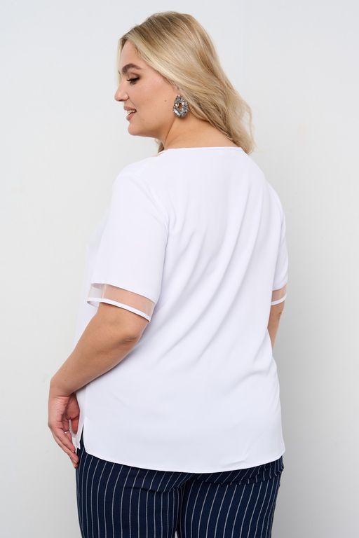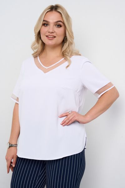 Однотонная блузка основа для классических образов современных женщин, которая прекрасно подходит для создания как повседневного, так и коктейльного образа. Блузка выполнена из качественной, шелковистой, приятной к телу струящейся ткани, которая не мнется, не пилингуется и сохраняет внешний вид долгое время, а значит, будет радовать Вас не один сезон. Фишкой топа является декоративный элемент вставка из сетки по горловине и по рукавам. Детали: V- образный вырез горловины, прямой силуэт, разрезы в боковых швах, короткий рукав с сеткой.