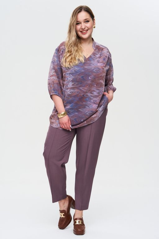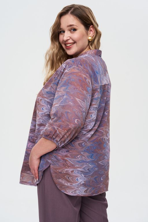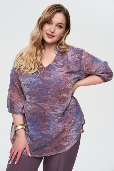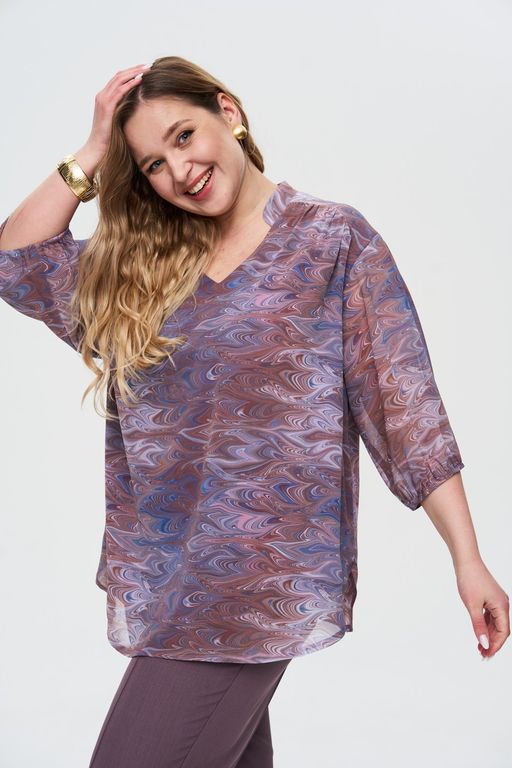 Романтичная блузка с V-образным вырезом идеально подходит для создания женственных образов. Особый шарм блузке придает принт. Блузка выполнена из качественного легкого шифона, который приятенк телу, не мнётся и красиво струится. Детали: рукав ¾ на резинке, свободный крой, округлый низ изделия.