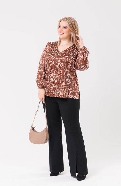 Блуза силуэта трапеция выполнена из "шёлка". Рукав втачной низ на резинке. Боковые разрезы.