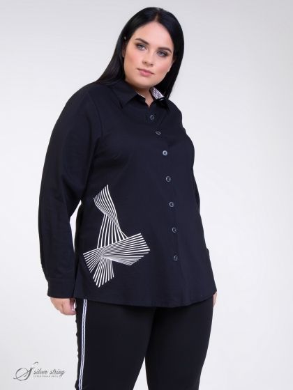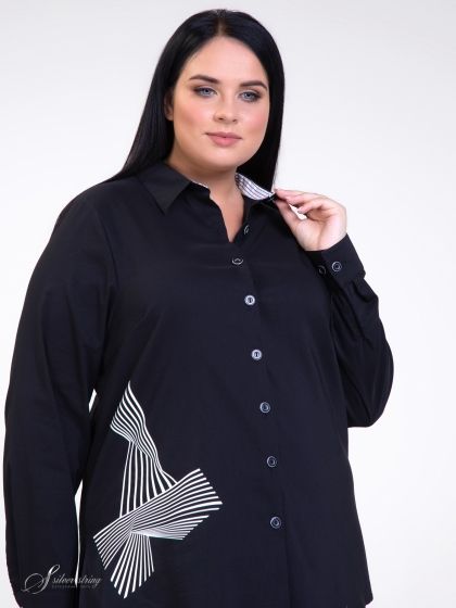 Оригинальная блуза-рубашка прямого силуэта с воротником на стойке. Модель изготовлена из однотонной ткани с высоким содержанием хлопка и добавлением эластана. Рукав втачной, длинный, с притачной манжетой. Объем манжеты можно регулировать с помощью парных пуговиц. В качестве отделки использована ткань в полоску. Откликом отделочной ткани является оригинальный принт на правой полочке. При создании принта использовался специальный пластификатор, который позволяет рисунку выдерживать длительную эксплуатацию изделия. В боковых швах обработаны разрезы. Эта модель обеспечит максимальный комфорт при любых обстоятельствах.