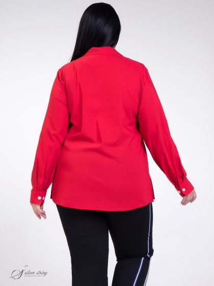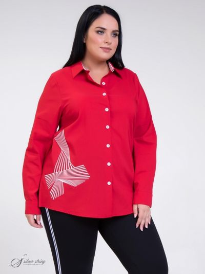 Оригинальная блуза-рубашка прямого силуэта с воротником на стойке. Модель изготовлена из однотонной ткани с высоким содержанием хлопка и добавлением эластана. Рукав втачной, длинный, с притачной манжетой. Объем манжеты можно регулировать с помощью парных пуговиц. В качестве отделки использована ткань в полоску. Откликом отделочной ткани является оригинальный принт на правой полочке. При создании принта использовался специальный пластификатор, который позволяет рисунку выдерживать длительную эксплуатацию изделия. В боковых швах обработаны разрезы. Эта модель обеспечит максимальный комфорт при любых обстоятельствах.