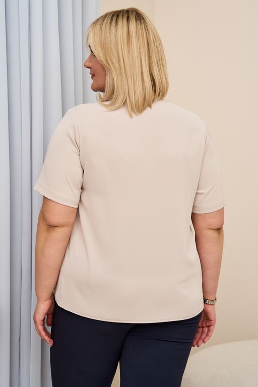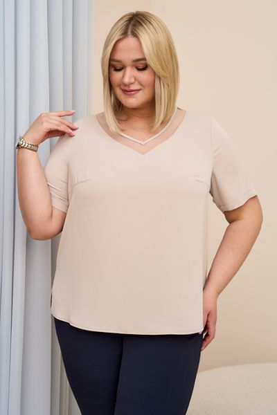 Однотонная блузка основа для классических образов современных женщин, которая прекрасно подходит для создания как повседневного, так и коктейльного образа. Блузка выполнена из качественной, шелковистой, приятной к телу струящейся ткани, которая не мнется, не пилингуется и сохраняет внешний вид долгое время, а значит, будет радовать Вас не один сезон. Фишкой топа является декоративный элемент вставка из сетки. Детали: V- образный вырез горловины, прямой силуэт, разрезы в боковых швах, короткий рукав. Модель представлена в двух цветах классическом черном и нюдовый бежевый