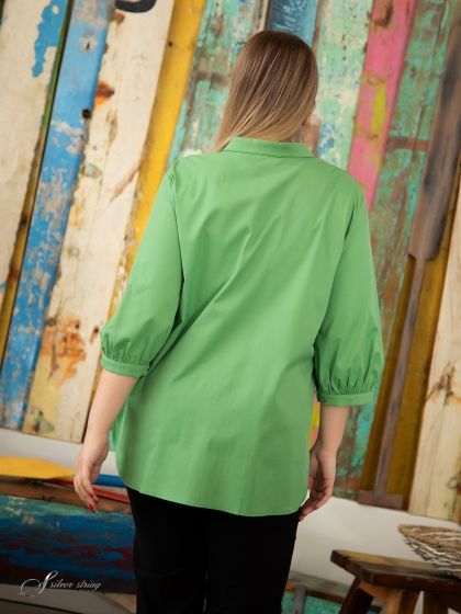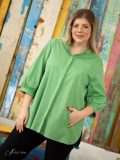 Современная блуза-рубашка прямого силуэта, с воротником – стойкой и супатной застежкой на пуговицы. Модель выполнена из эластичной ткани с высоким содержанием хлопка. Особого внимания заслуживает высокое качество ткани. Переплетение нитей в полотне, придает материалу шелковистость и легкий блеск. Левая и правая сторона полочки имеют разные линии сечения: на правой полочке проходит горизонтальная кокетка с нагрудным карманом, а левая полочка разделена вертикальным рельефом с карманом в шве. Рукав втачной, объемный, длиной 3/4, с притачной манжетой. Объем манжеты, по низу рукава, можно регулировать с помощью парных пуговиц. В боковых швах обработаны разрезы скругленной формы. Модель олицетворяет собой притягательность классики в современном её звучании.