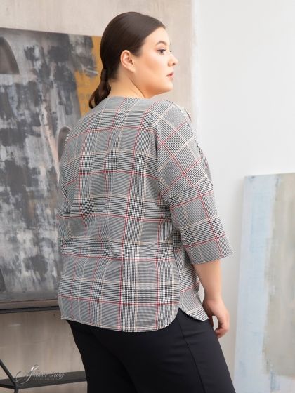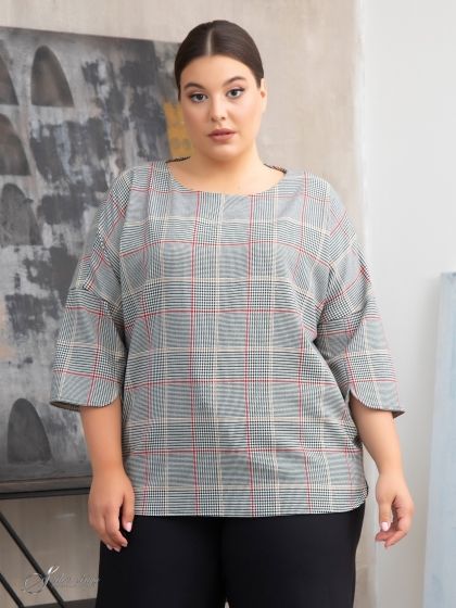 Стильная блуза Т-образного силуэта выполнена из мягкой ткани с рисунком в клетку «гленчек». Горловина округлой формы, слегка расширена к плечам. Изделие с удлиненной линией плеча и рукавом длиной 3/4. В переднем шве рукава расположен небольшой разрез скругленной формы. Аналогичной формы разрезы обработаны и в боковых швах. Это базовая модель, которая займет лидирующую позицию в Вашем гардеробе.