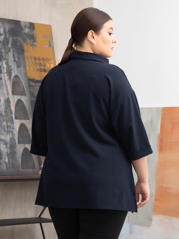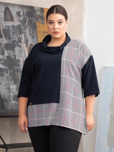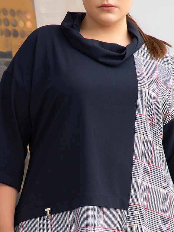 Оригинальная блуза Т-образного силуэта изготовлена из эластичных материалов компаньонов контрастной расцветки. Линии сечений на полочке формируют квадратную однотонную вставку на клетчатом фоне. Рукав длиной 3/4 оформлен отворотом. Оригинально выполнен воротник хомут, который напоминает шарфснуд: он перекручен по центру полочки и втачен в горловину только ближе к плечевым швам и по спинке. Линия низа в модели слегка удлинена к бокам. В боковых швах обработаны разрезы. Эффектный дизайн и отличная посадка изделия помогут подчеркнуть Вашу индивидуальность и стиль.