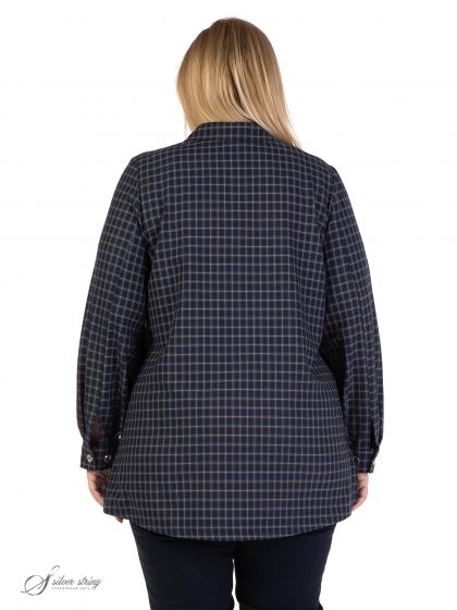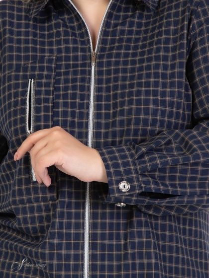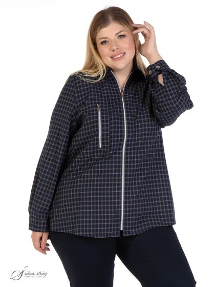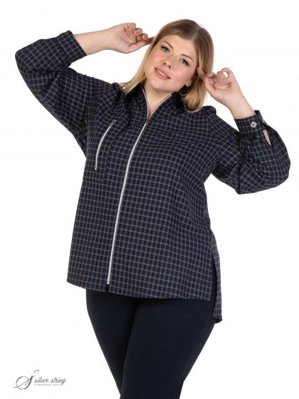 Блуза в спортивном стиле, прямого силуэта, выполнена из натуральной смесовой ткани с рисунком в клетку. Модель с рубашечным воротником на стойке и застежкой на молнию контрастного цвета. Рукав втачной, длинный, с притачной манжетой по низу. Обхват манжеты можно регулировать с помощью парных пуговиц. На правой полочке расположен накладной карман с застежкой-молнией. Изделие с асимметричной линией низа: спинка удлинена относительно полочки. В боковых швах расположены разрезы. Такой крой отлично маскирует проблемные зоны, стройнит и вытягивает фигуру.