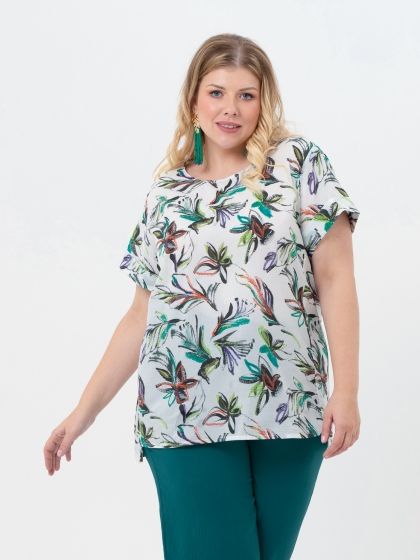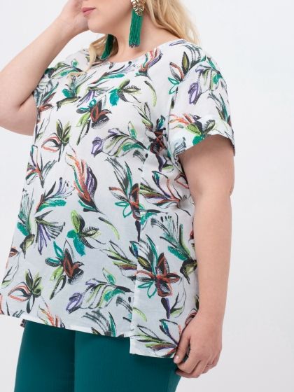 Эффектная Блузка прямого силуэта выполнена из хлопковой ткани с ярким цветочным рисунком. Линия горловины округлой формы слегка расширена к плечам. Низ короткого рукава оканчивается мягким отворотом. Изделие с асимметричной линией низа: спинка удлинена относительно полочки. В боковых швах обработаны разрезы. Модель отличает изысканный принт и практичность высококачественной ткани.