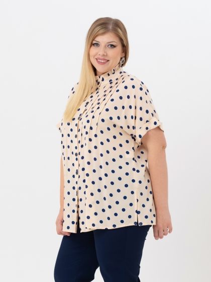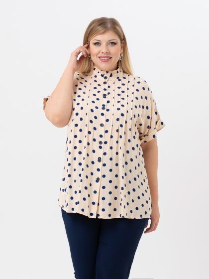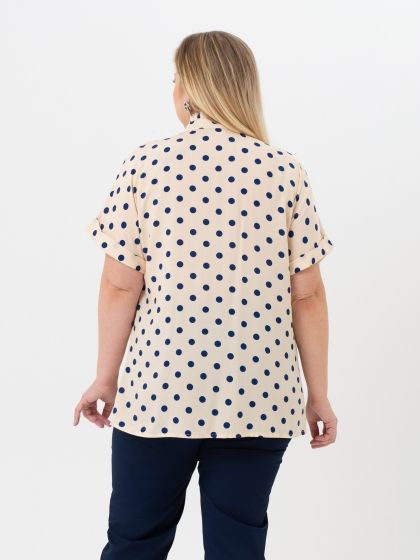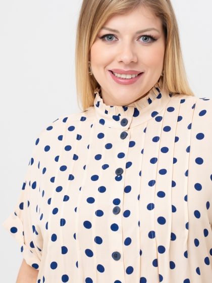 Элегантная блузка свободного силуэта выполнена из 100% вискозной ткани с контрастным рисунком «горох». Модель с застежкой на пуговицы и коротким рукавом покроя «кимоно». Низ рукава оканчивается отворотом. На полочке застрочены вертикальные защипы, которые визуально сужают и вытягивают верхнюю часть фигуры. Верхний край стойки оформлен рюшей. В боковых швах обработаны разрезы. Непринуждённость и удобство модели сочетается с нежным женственным стилем. Блузка, безусловно, станет базовой вещью в Вашем гардеробе.