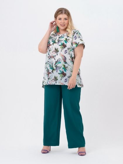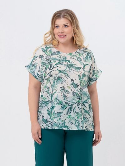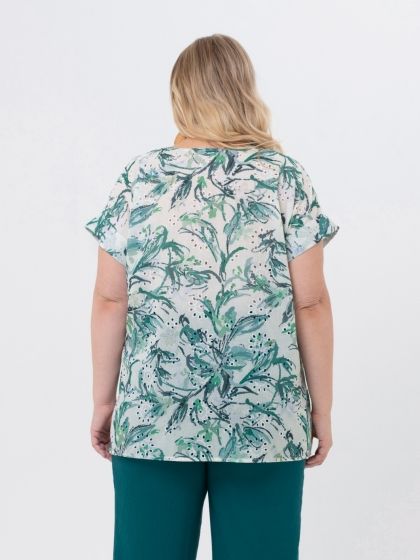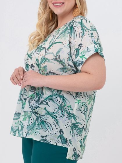 Стильная блузка Т-образного силуэта из ткани с перфорированной вышивкой в технике «Ришелье» и цветочным рисунком — Ваш идеальный выбор для создания легкого, летнего образа. Модель с цельнокроеным коротким рукавом. Низ рукава оформлен отворотом. Горловина округлой формы слегка расширена к плечам. Изделие с разноуровневым низом: спинка удлинена относительно полочки. Такой крой отлично стройнит и вытягивает фигуру. Эта Блузка - отличный выбор для тех, кто ценит комфорт и хочет выглядеть модно.