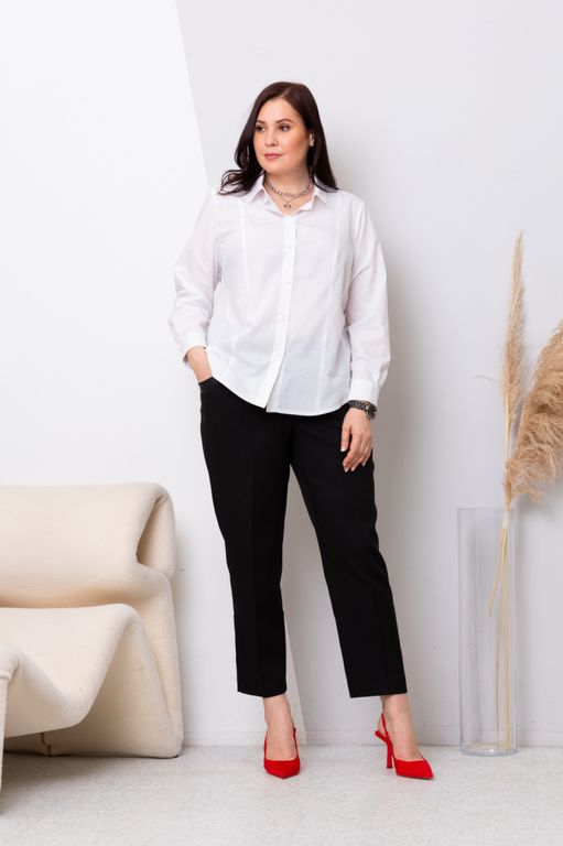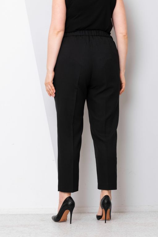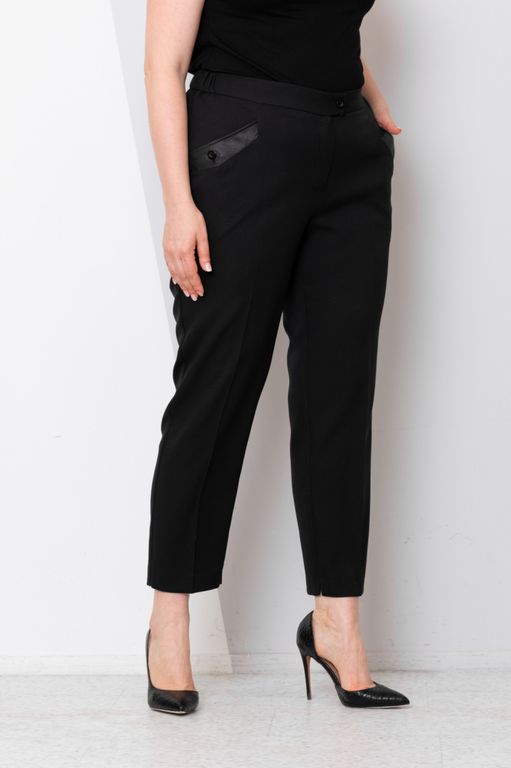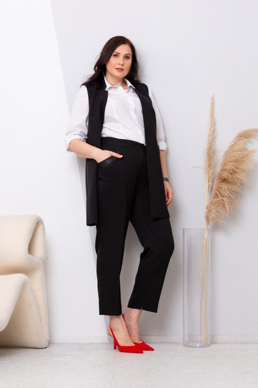 Стильные офисные брюки. Классической длины, со стрелками, слегка зауженные. Карманы с фиксацией на пуговицу. Листовицы из искусственной кожи идеально сочетаются с жилетом "Сонет". Пояс частично на резинке, с застежкой на молнию и пуговицу. По низу во внутренних швах небольшие разрезы. Брюки выполнены из поливискозы со стрейчем и станут основой для множества элегантных образов.
