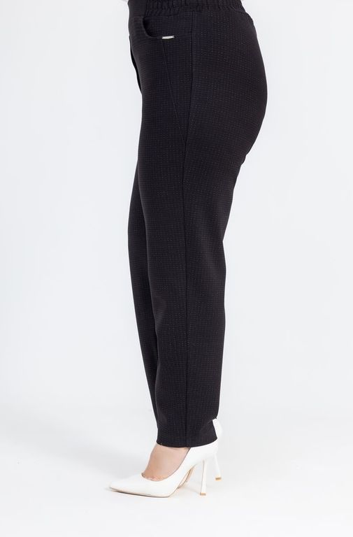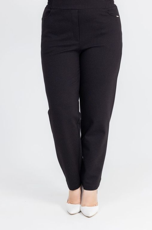 Трикотажные брюки слегка зауженные к низу. Пояс на круговой резинке, два кармана.