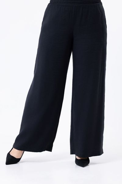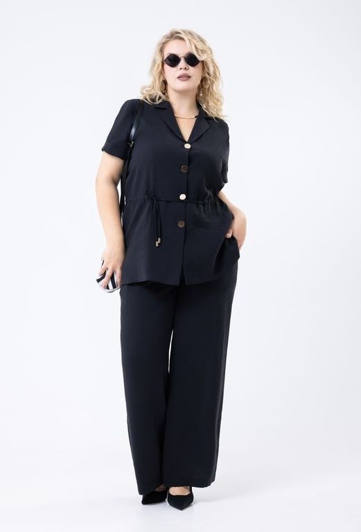 Брюки трубы выполнены из ткани "Queen moka". Пояс на резинке, два кармана.