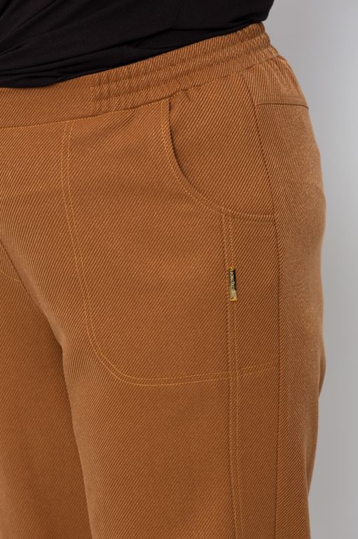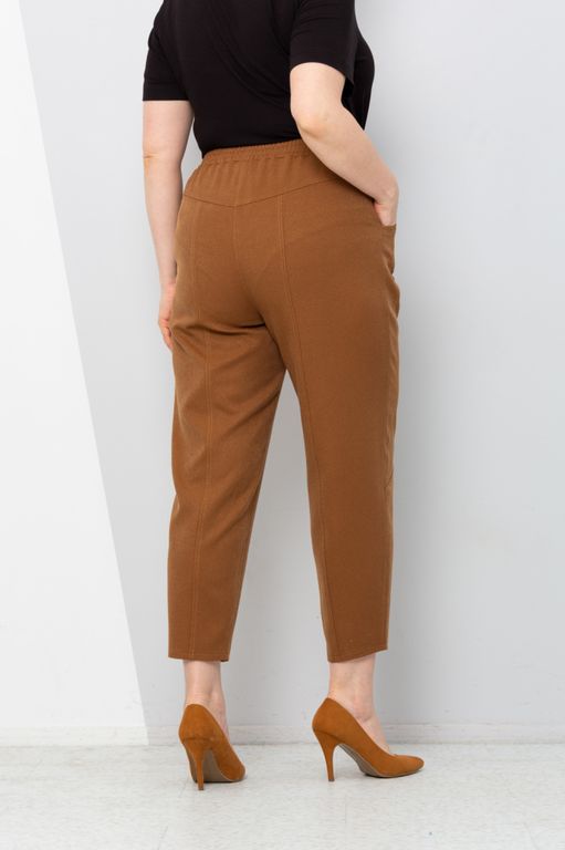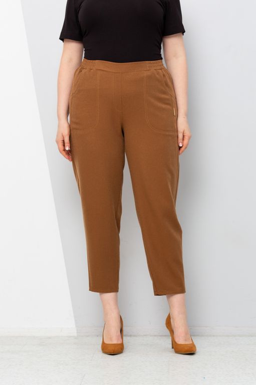 Яркие брюки-бананы. Выполнены из смесовой костюмной ткани на основе хлопка, фактура - диагональный рубчик. Брюки слегка укороченные, пояс на резинке, без застежки. Вертикальные рельефы полочки переходят в вытачки. Спинка на кокетке, с вертикальными рельефами. Функциональные карманы оформлены контрастной строчкой.