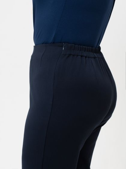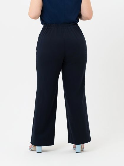 Стильные брюки свободного силуэта выполнены из однотонной, эластичной смесовой ткани. Застежка на молнию расположена в левом боковом шве. Верхний срез передних половинок брюк обработан подкройными обтачками. По спинке расположен отрезной пояс с эластичной тесьмой. Силуэт брюк великолепно стройнит фигуру, придавая легкость и динамику Вашему образу. Эти брюки - прекрасный выбор для любого случая: будь то деловая встреча или повседневный выход.