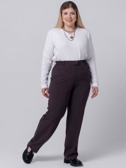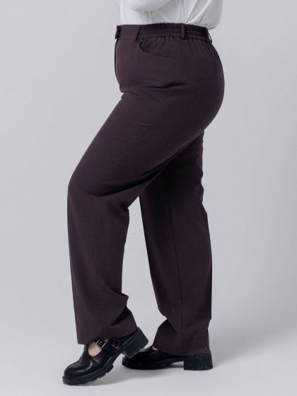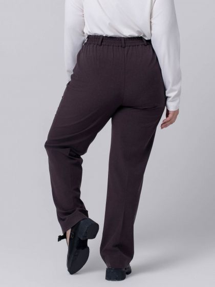 Свободные прямые брюки, стандартной длины, выполнены из эластичной смесовой ткани с высоким содержанием натурального волокна. На передних половинках расположены подрезные карманы. Модель с застежкой на молнию и пару крючков. Эластичная тесьма проложена по поясу задних половинок брюк и достигает середины переда. Шлевки, расположенные по периметру пояса помогут дополнить ваш образ стильным аксессуаром в виде декоративного ремня. На брюках заутюжены стрелки, которые придают стройность, подчеркивают ухоженность и респектабельность. Брюки станут идеальным выбором для создания комфортного и элегантного образа.