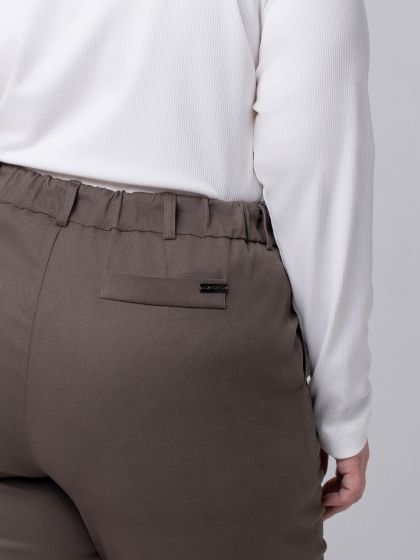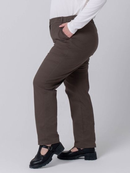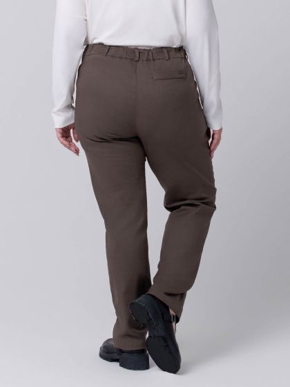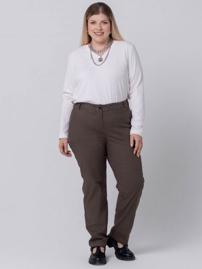 Брюки прямого силуэта изготовлены из эластичной смесовой ткани, по структуре напоминающей деним. На передних половинках брюк обработаны подкройные карманы. На правой стороне спинки настрочена ложная листочка. Модель с застежкой на молнию, по всему периметру пояса проложена тесьма-резинка и настрочены шлевки. Силуэт брюк великолепно стройнит фигуру. Их плюс в том, что они удачно сочетаются с совершенно любой обувью от таких модных нынче кед до изящных туфель-лодочек. Прекрасный вариант для базового гардероба, ведь такие брюки впишутся в каждый из выбранных вами стилей.