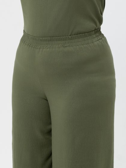 Стильные брюки-палаццо станут отличным дополнением к вашему гардеробу, сочетая в себе стиль и удобство. Они выполнены из однотонной «крэшированной» вискозной ткани с добавлением эластана. Модель без застежки, с удобной резинкой по поясу, идеально подойдет для расслабленных повседневных образов. Брюки выполнены с учетом особенностей фигуры полных дам, что позволяет обеспечить максимальный комфорт и свободу движений.