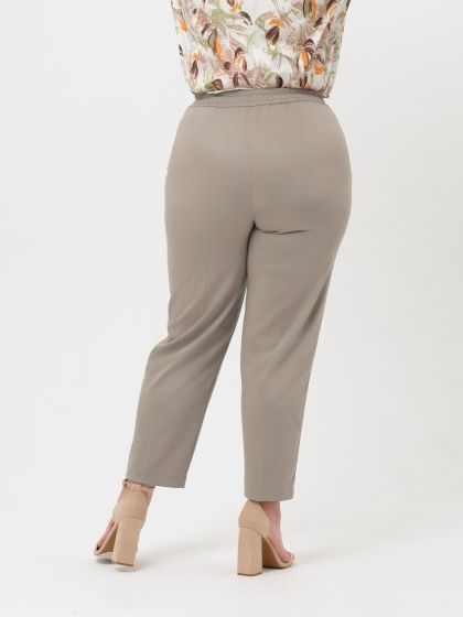 Современные брюки длиной до щиколотки, зауженные к низу, изготовлены из гладкокрашеной ткани с высоким содержанием натурального волокна. По центру передних половинок брюк застрочены защипы - стрелки. По бокам обработаны удобные подкройные карманы. Модель с эластичным поясом и без застежки. Тесьма-резинка по всему контуру пояса обеспечивает идеальную посадку и удобство носки, а дополнительный шнур-затяжка позволяет регулировать объем. Прекрасный вариант для базового гардероба, модель отличается правильной посадкой и прослужит не один год.