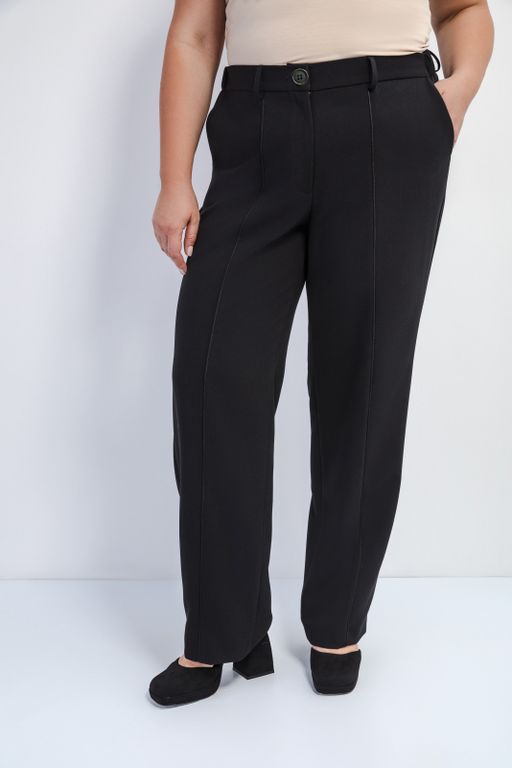 Брюки прямые из поливискозы с шелковистым кантом на стрелках.