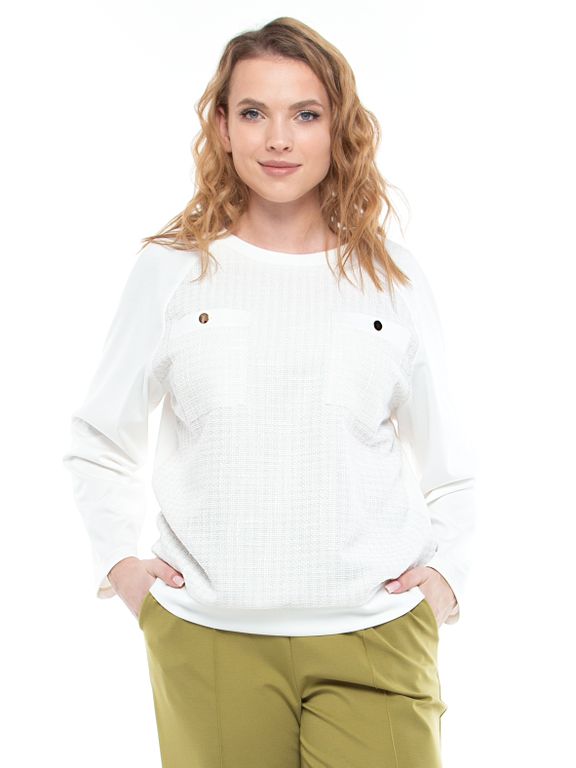 Джемпер полуприлегающего силуэта из вискозного джерси. Перед из фактурного букле с деликатным блеском. Округлая горловина. Рукав реглан длинный. Накладные карманы на переде декорированы металлическими пуговицами. Низ на манжете. Длина по спинке от плечевого шва 66 см.