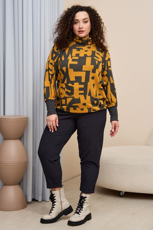 Удобный, стильный джемпер с ярким актуальным принтом. Теплый, приятный к телу материал согреет Вас в прохладную погоду. Джемпер свободного кроя. Длинные рукава на широкой манжете, по низу изделия кулиса на резинке для регулирования длины, воротник мягкая стойка, хаотичные защипы по переду добавляют изюминку. Модель представлена в двух цветах в зеленом и цвете горчица.