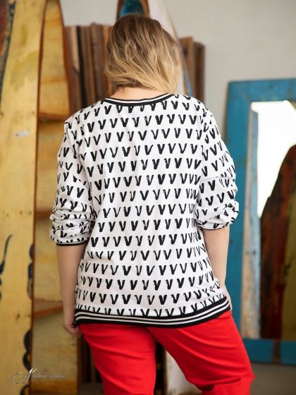Современный свитшот прямого силуэта выполнен из хлопкового трикотажного полотна с оригинальным рисунком. Модель с длинным втачным рукавом и округлой линией горловины. На полочке настрочен нагрудный карман. Низ изделия, низ рукава и горловина обработаны трикотажными планками – подвязами. Графичность модели в сочетании с отличной посадкой позволит Вам выглядеть современно и стильно.