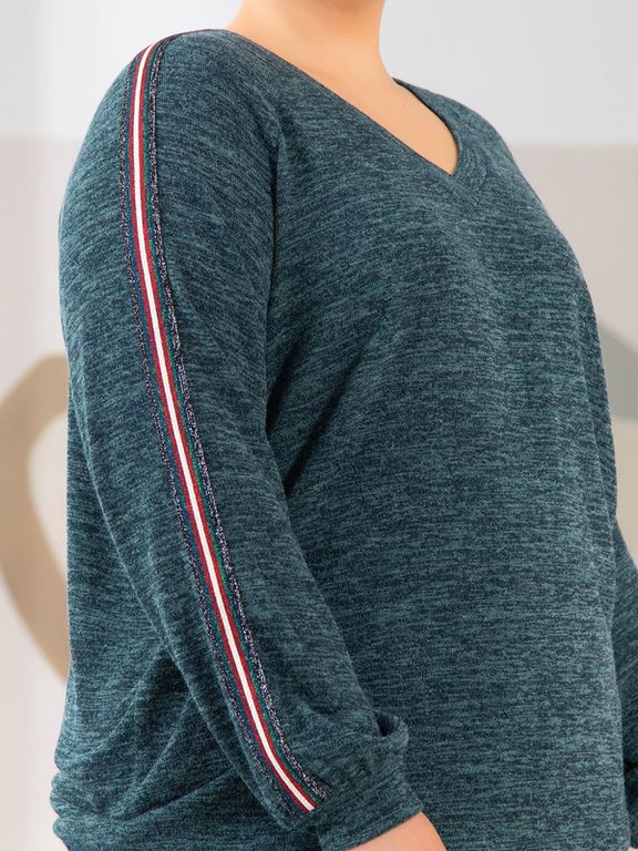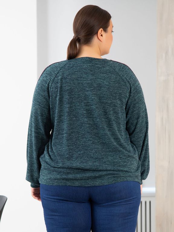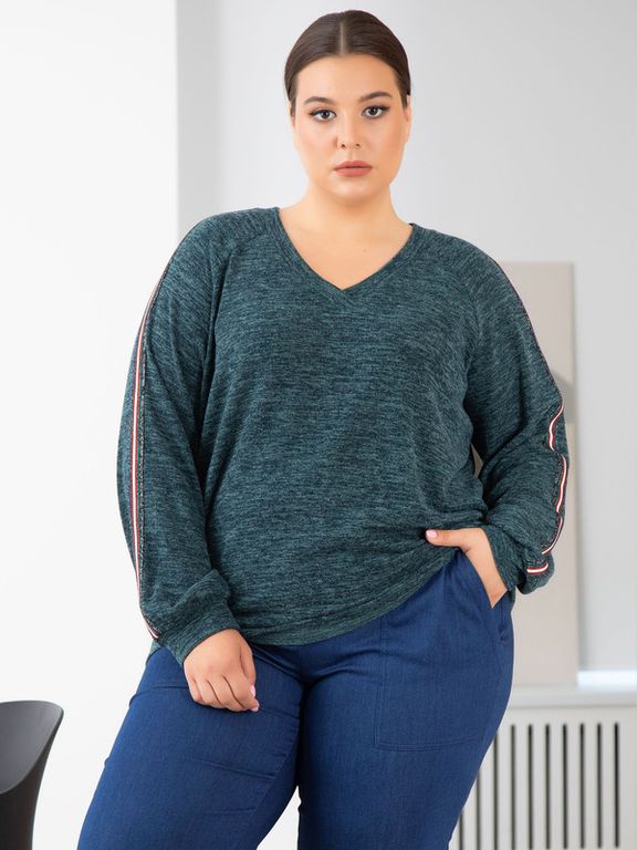 Джемпер пуловер прямого силуэта изготовлен из мягкого трикотажного полотна. Модель с длинным, объемным рукавом, покроя реглан. Понизу рукав присобран на круговую манжету из основного материала. Vобразная горловина обработана трикотажными планками. Вдоль верхнего шва рукава: от горловины до манжеты, настрочена декоративная тесьма. В модели учтены особенности фигуры дам нестандартных размеров. Блуза станет базовой вещью в Вашем гардеробе.