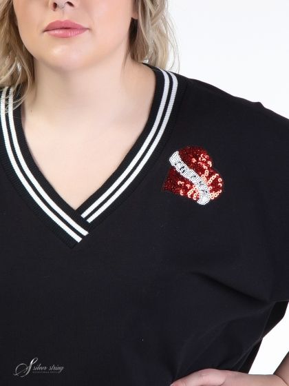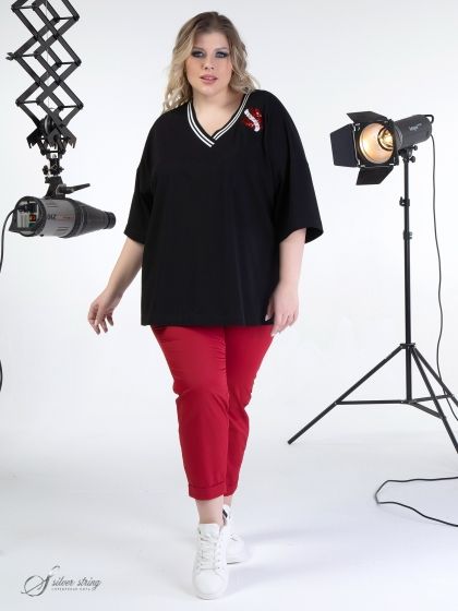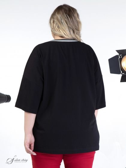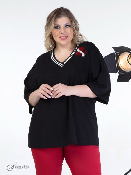 Эффектный блузон Т-образного силуэта с цельнокроеным рукавом длиной за локоть. Модель выполнена из высококачественного трикотажного полотна с большим содержанием хлопка. Горловина У-образной формы обработана трикотажными планками с белыми полосами. На левой стороне полочки настрочена оригинальная аппликация из пайеток. Это базовая модель, которая прекрасно впишется в Ваш гардероб и станет незаменимой при создании разнообразных комплектов.