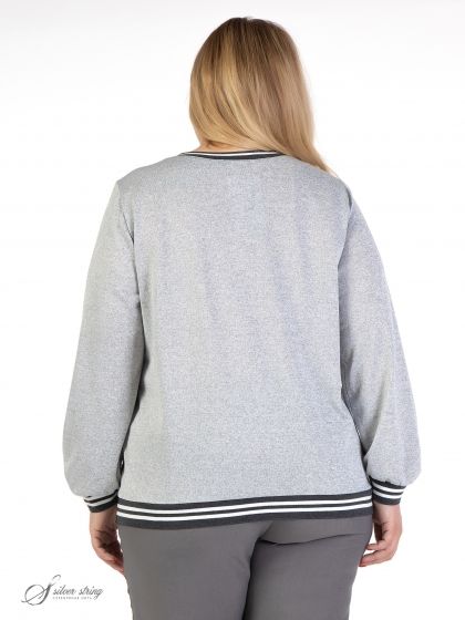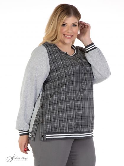 Оригинальный джемпер прямого силуэта, с круглой линией горловины, выполнен из материалов-компаньонов: однотонного трикотажного полотна и ткани с рисунком в клетку. Модель с длинным, втачным рукавом. Линия горловины, низ рукава и низ изделия оформлены трикотажным декоративным подвязом. Вдоль правого бокового шва обработана шлица с застежкой на кнопки квадратной формы. Это комфортная модель в спортивном стиле, которая прекрасно впишется в Ваш гардероб.
