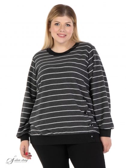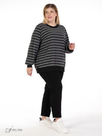 Эффектный джемпер прямого силуэта выполнен из мягкого трикотажного полотна с фактурной выработкой контрастного цвета. Модель с длинным втачным рукавом и округлой линией горловины. Низ рукава и низ основы присобран на притачную планку из трикотажного подвяза контрастного цвета. Аналогичной планкой обработана горловина джемпера. Изюминкой модели является ложная шлица с имитацией застежки на пуговицы, которая расположена на левой стороне полочки. Эта модель прекрасно впишется в Ваш гардероб и подарит настроение и комфорт. Изделие обладает динамикой и графичностью, что в сочетании с отличной посадкой позволит Вам выглядеть современно и стильно.