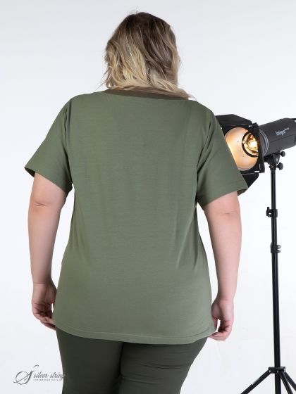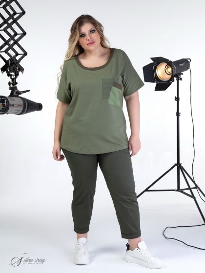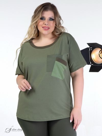 Оригинальный трикотажный блузон прямого силуэта выполнен из трикотажного полотна с высоким содержанием хлопка. Горловина округлой формы, немного расширена к плечам и обработана планкой из отделочного материала. Рукав цельнокроеный, длиной до локтя. Дополняют образ пара карманов, хаотично настроченных один поверх другого. В модели чувствуются задор и непринуждённость.