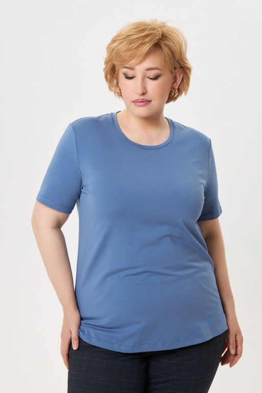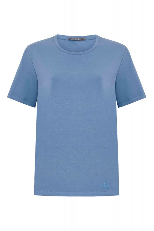 Футболка базовая со спущенным плечом прямого силуэта и разноуровневым низом цвета деним. Изделие декорировано логотипом из страз в цвете деним. Трикотажное полотно из хлопка с эластаном позволяет чувствовать себя комфортно с любыми особенностями фигуры. Модель футболки подходит на все типы фигур. Предлагаем использовать базовую футболку как основной или дополнительный слой в любом Вашем образе.