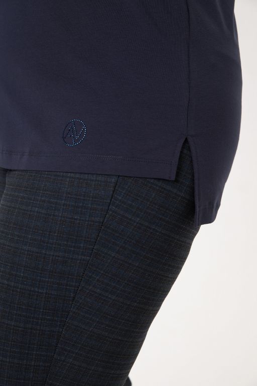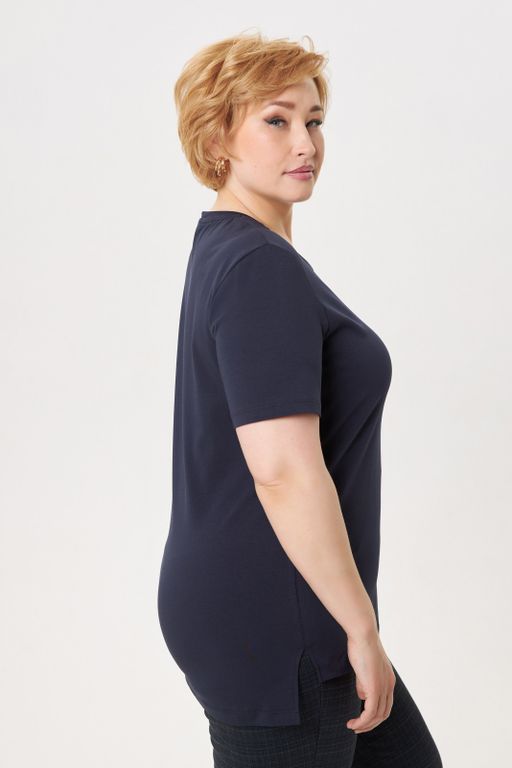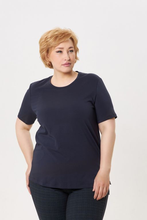 Футболка базовая со спущенным плечом прямого силуэта и разноуровневым низом цвета деним. Изделие декорировано логотипом из страз в цвете деним. Трикотажное полотно из хлопка с эластаном позволяет чувствовать себя комфортно с любыми особенностями фигуры. Модель футболки подходит на все типы фигур. Предлагаем использовать базовую футболку как основной или дополнительный слой в любом Вашем образе.