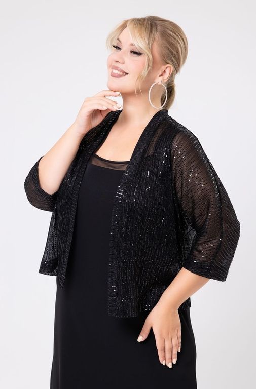 Нарядный жакет свободного силуэта выполнен из трикотажного полотна с пайетками. Цельнокроенный рукав.