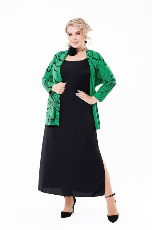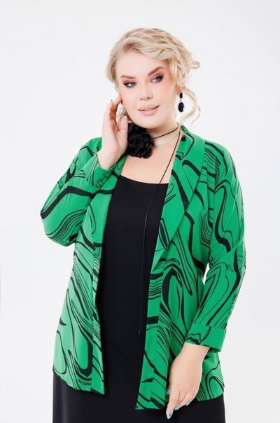 Жакет прямого силуэта с дизайнерским принтом, цельнокроенный рукав, разрезы по бокам, пояс.