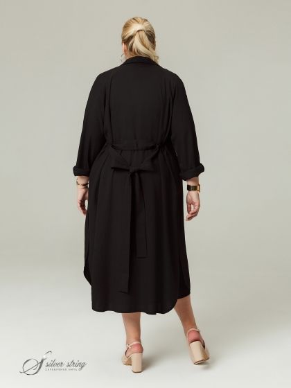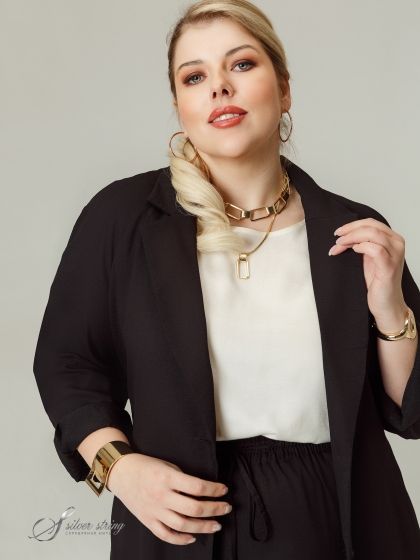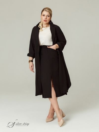 Удлиненный жакет - «шазюбль» прямого силуэта выполнен из фактурной смесовой ткани с большим содержанием натурального волокна. Модель с английским воротником на углубленной горловине и застежкой на крупные пуговицы. Изделие с удобными карманами в швах и съемным поясом. Линия низа асимметричной формы: спинка значительно удлинена относительно полочки. В боковых швах обработаны высокие скругленные разрезы. Один из главных плюсов шазюбля — его универсальность, отличная способность сочетаться с вещами в разнообразных стилях и дополнять разные комплекты. Шазюбль можно носить с брюками, юбками, платьями; с длинными и короткими вещами, с классической, спортивной и одеждой в стиле «Casual». Второй плюс — способность создавать вертикаль и вытягивать фигуру, скрывая недостатки и добавляя стройности.
