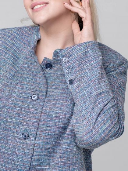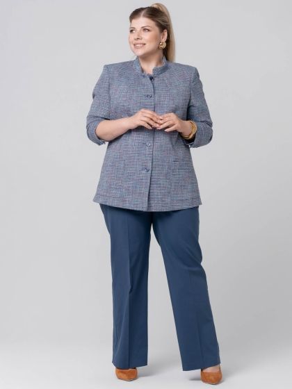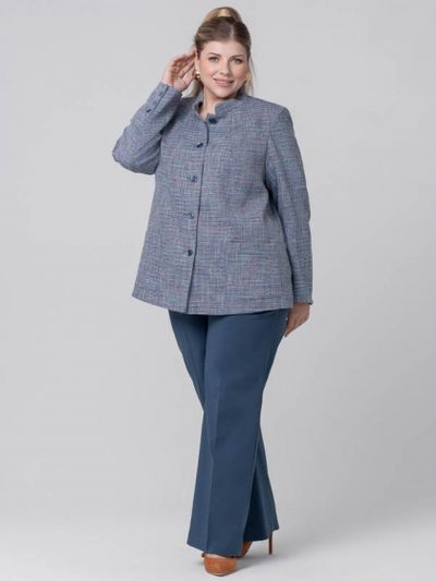 Эффектный жакет прямого силуэта выполнен из фактурной смесовой ткани с мелким рисунком, воссоздающим меланжевый эффект. Модель с воротником-стойкой и застежкой на пуговицы. На полочке настрочены накладные карманы. Рукав втачной, длинный. В локтевом шве расположена шлица с застежкой, которая позволит подвернуть рукав до нужной длины. Полочка жакета обработана подкладкой. Это стильная модель, выполненная в стиле smart-casual, прекрасно подойдет для создания разнообразных комплектов.
