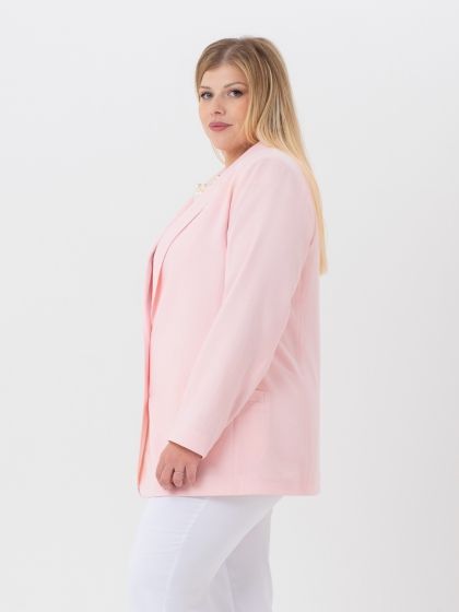 Классический жакет с английским воротником на углубленной горловине выполнен из однотонной гладкокрашеной ткани с высоким содержанием натурального волокна. Модель обработана подкладкой контрастного цвета, в цвет подкладки подобраны пуговицы. Жакет прямого силуэта, с длинным втачным рукавом. Край борта скруглен к низу. На полочке расположены прорезные карманы с листочкой. Нежный, пастельный цвет изделия пропитан летним настроением. Жакет выглядит очень элегантно и выгодно подчеркнет женский силуэт. Секрет заключается в идеальных лекалах и отличном исполнении.