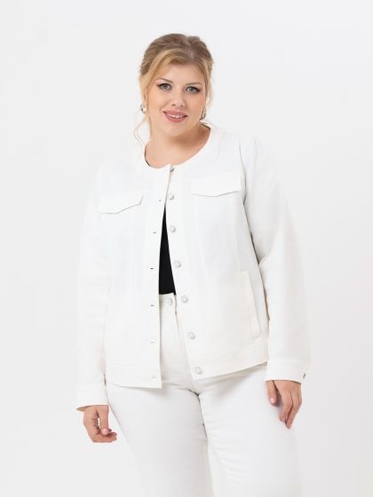 Молодежный жакет, стилизованный под джинсовую куртку, выполнен из эластичной смесовой ткани, по структуре напоминающей деним. Модель прямого силуэта, с притачным поясом по низу. Горловина округлой формы без воротника. По борту обработана застежка на металлизированные пуговицы - болты. Рукав втачной, длинный, с манжетой по низу. Обхват манжеты можно регулировать за счет парных пуговиц. На полочке и спинке обработаны подрезные кокетки с вертикальными рельефами. По линии кокетки полочки расположены клапана, а в рельефах – карманы с листочками. Такой жакет подойдет для создания разнообразных комплектов и с платьями и с брюками.
