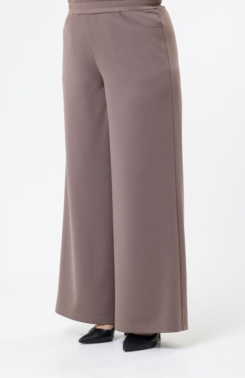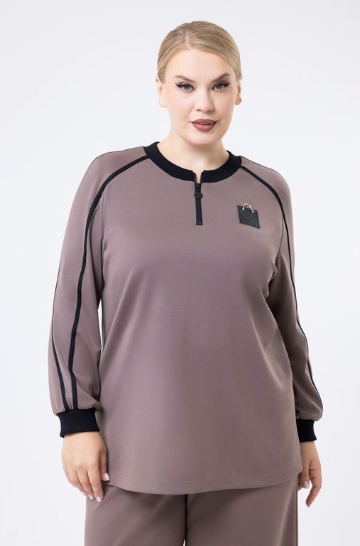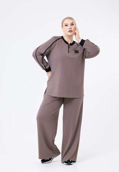 Костюм выполнен из трикотажного полотна. Спущенный рукав. Брюки трубы, комфортный пояс на резинке. Два кармана.