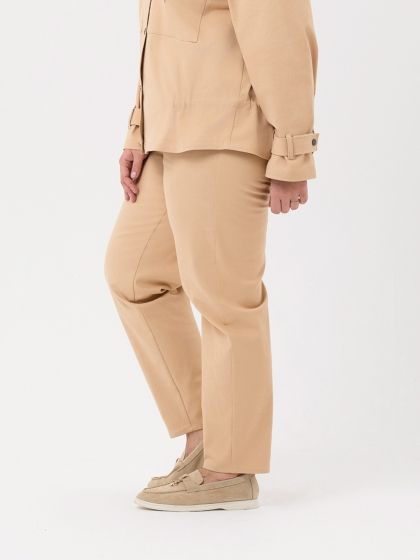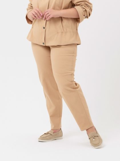 Современные брюки, зауженные к низу, изготовлены из однотонной смесовой ткани, с большим содержанием эластана, по структуре напоминающей деним. Для комфортной эксплуатации, помимо застежки на молнию, по всему периметру пояса проложена тесьма-резинка и настрочены шлевки. Модель выполнена с учетом особенностей фигуры полных дам и позволяет обеспечить максимальный комфорт и безупречную посадку. Прекрасный вариант для базового гардероба.