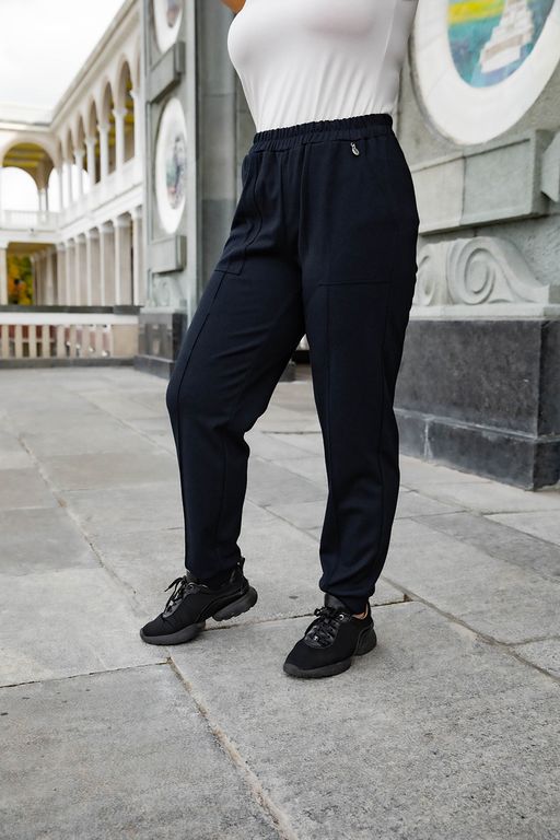 Брюки из прекрасного джерси выполнены в спортивном стиле с карманами. Комфортный свободный силуэт внизу подхвачен манжетами. По бокам вставки из черного джерси и трикотажной блестящей тесьмы визуально вытягивают и стройнят. Длина изделия 98см.