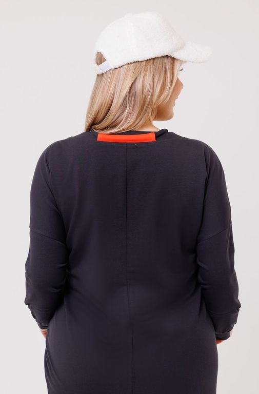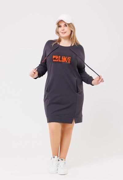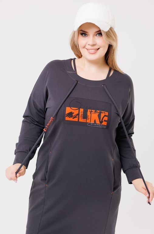 Платье из футера полуприлегающего силуэта со спущенным плечом.