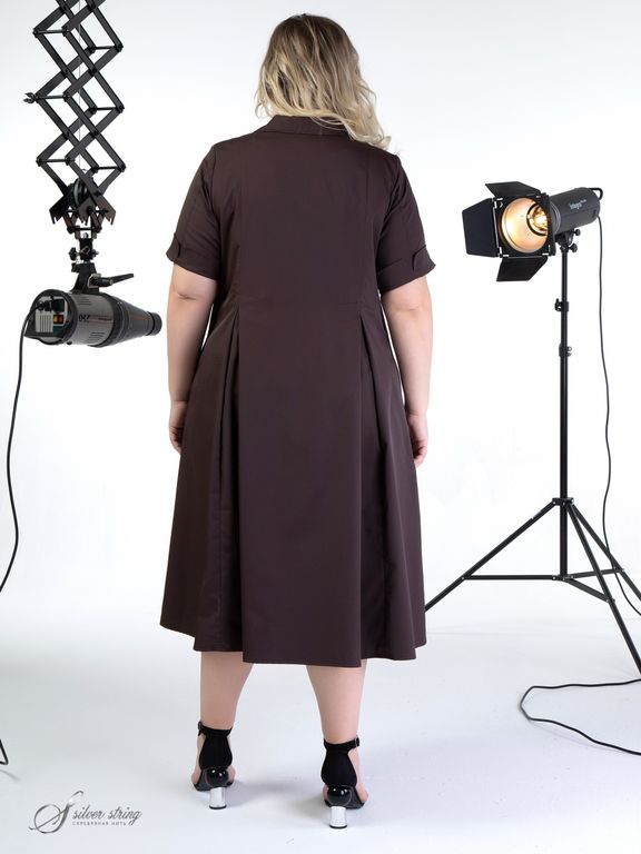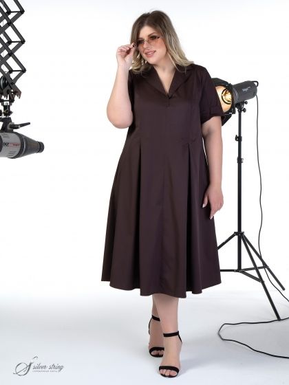 Элегантное платье А-образного силуэта, длиной до середины икры, выполнено из натуральной, гладкокрашеной ткани. Сатиновое переплетение нитей в полотне, придает материалу бархатистость и приятный блеск. Модель с У-образной линией горловины, оформленной «Английским воротником». Рукав втачной, длиной до локтя. Вертикальные линии сечения рукава образуют локтевой и передний швы, с миниатюрными разрезами понизу. При желании рукав можно носить «на отворот». На полочке и спинке расположены вертикальные рельефы, которые раскрываются встречными складками. В боковых швах обработаны удобные карманы. Модель выглядит очень эффектно, отлично маскирует проблемные зоны и стройнит фигуру.