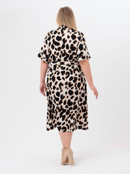 Эффектное платье прямого силуэта выполнено из натуральной ткани с контрастным принтом. Модель с рубашечным воротником на стойке и коротким цельнокроеным рукавом с имитацией отворота по низу. Изделие длиной «миди», распашное, с планкой-застежкой на пуговицы в цвет ткани. На полочке настрочены накладные карманы. Модель комплектуется съемным поясом. В этом сезоне платья-рубашки особенно актуальны, такой фасон прекрасно скрывает возможные недостатки фигуры, выглядит стильно и современно.