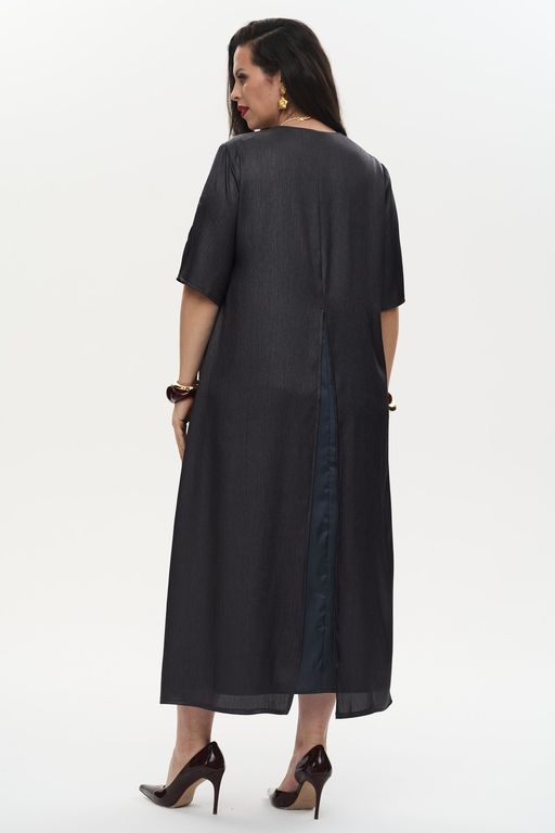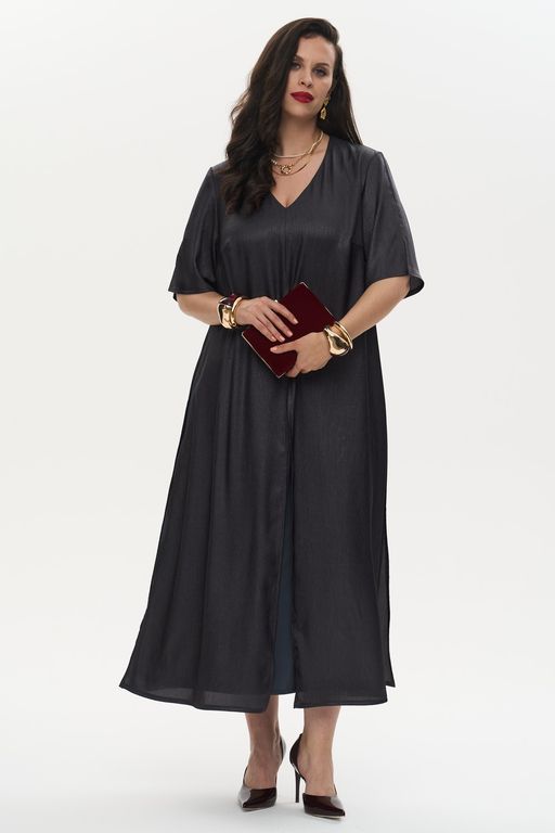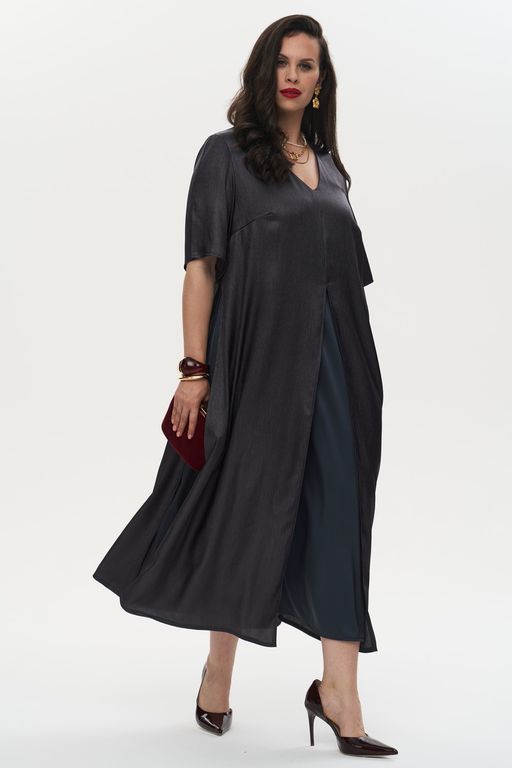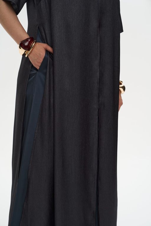 Элегантное женское платье выполнено из шелковистой ткани с креш-эффектом. V-образный вырез горловины придает изящество. Это двухслойная модель А-силуэта. Верхнее платье свободного кроя дополнено высокими разрезами. Втачные рукава отделаны небольшими разрезами. Нагрудные вытачки обеспечивают идеальную посадку. Нижнее платье оснащено практичными карманами. Застежка отсутствует. Платье доступно в двух цветовых решениях.