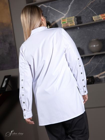 Стильная блуза-рубашка прямого силуэта в стиле «Casual». Модель с рубашечным воротником на стойке, выполнена из однотонной эластичной ткани с высоким содержанием хлопка. Рукав втачной, длинный, с притачной манжетой. В локтевом шве рукава обработана высокая шлица с застежкой на множество пуговиц. На левой полочке расположен нагрудный карман с декоративной патой с боку. Пата закреплена на кармане парными пуговицами. Изделие с разноуровневым низом: спинка длиннее полочки. В боковых швах обработаны высокие разрезы. Рубашку можно использовать как самостоятельное изделие, так и в комплекте с легким топом, создавая различные образы и комбинации, что поможет сделать Ваш гардероб разнообразнее.