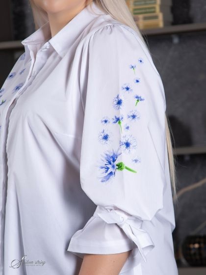 Стильная блуза полуприлегающего силуэта изготовлена из однотонной ткани с высоким содержанием хлопка и добавлением эластана. Модель с рубашечным воротником и супатной застежкой на пуговицы. Рукав втачной, длиной 3/4, по окату проходит легкая сборка.
