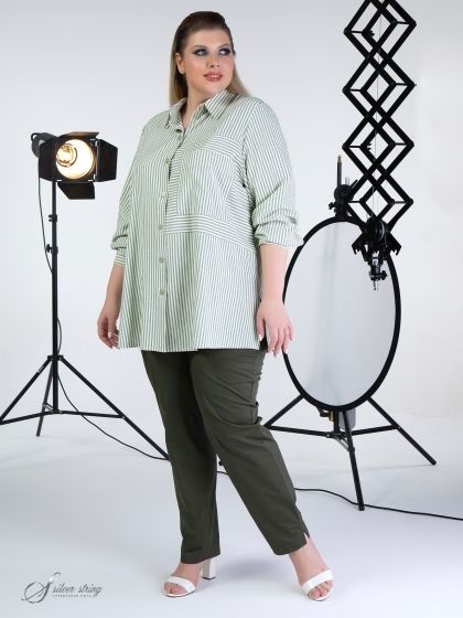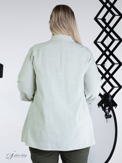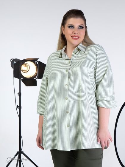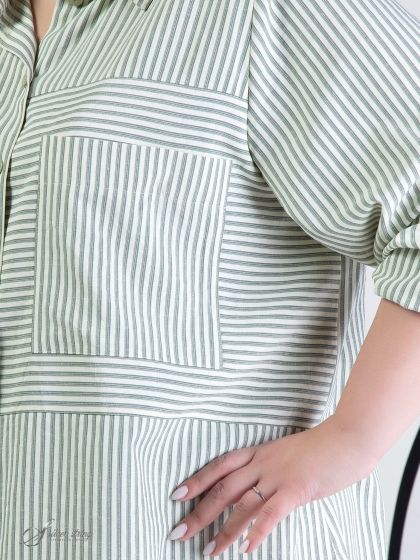 Современная блуза-рубашка прямого силуэта выполнена из смесовой натуральной ткани, с рисунком в полоску. Модель с воротником на стойке и застежкой на пуговицы. Рукав втачной, длинный, с притачной манжетой по низу. Объем манжеты можно регулировать с помощью парных пуговиц. На левой части полочки расположена подрезная вставка с нагрудным карманом. На смежных деталях рисунок расположен в разных направлениях. Боковые швы переходят в разрезы. Графичность модели в сочетании с отличной посадкой позволит Вам выглядеть современно и стильно.